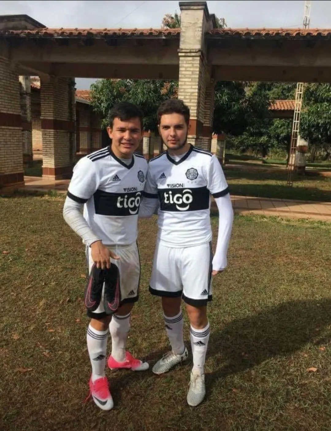 Abajo Elian Von Brand con la casaca del Olimpia,actual campeón de la APF, aparece con los botines en su mano.