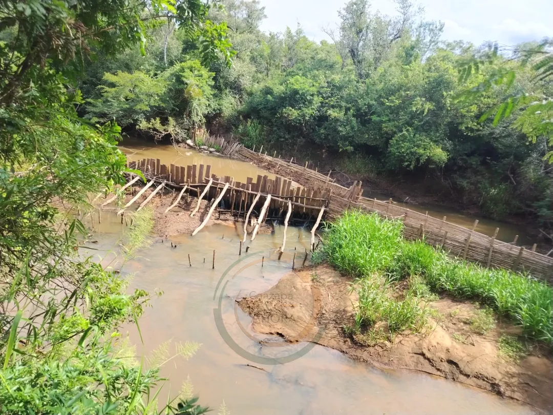 Las denominadas “pira ñuha” consisten en estructuras artesanales construidas con estacas de madera clavadas en el lecho del arroyo, reforzadas con tablas y ramas entrelazadas. Estas forman un cerco que prácticamente bloquea el paso natural del agua y canaliza el flujo hacia un punto estrecho donde los peces quedan atrapados.